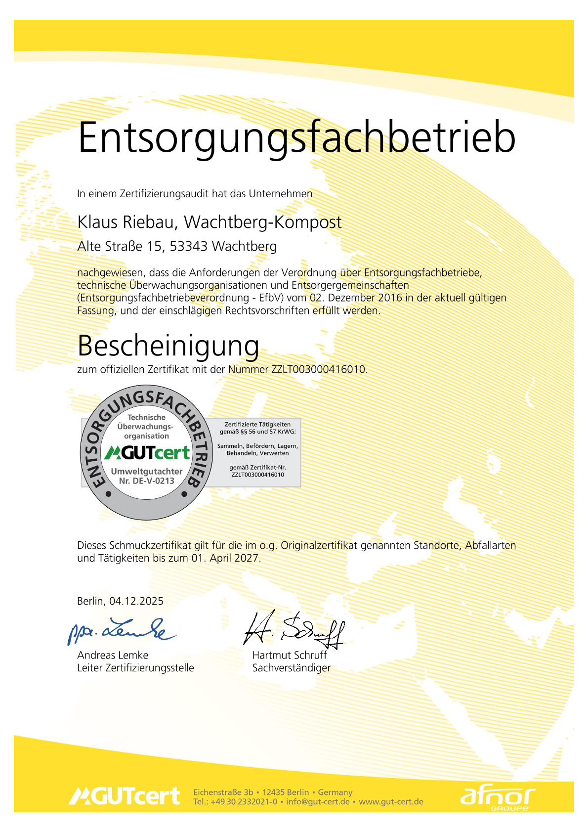 Zur Klärung von Detailfragen erreichen Sie mich unter 01725494881 oder per Mail info@wachtberg-kompost.de Ihr Klaus Riebau WACHTBERG-KOMPOST